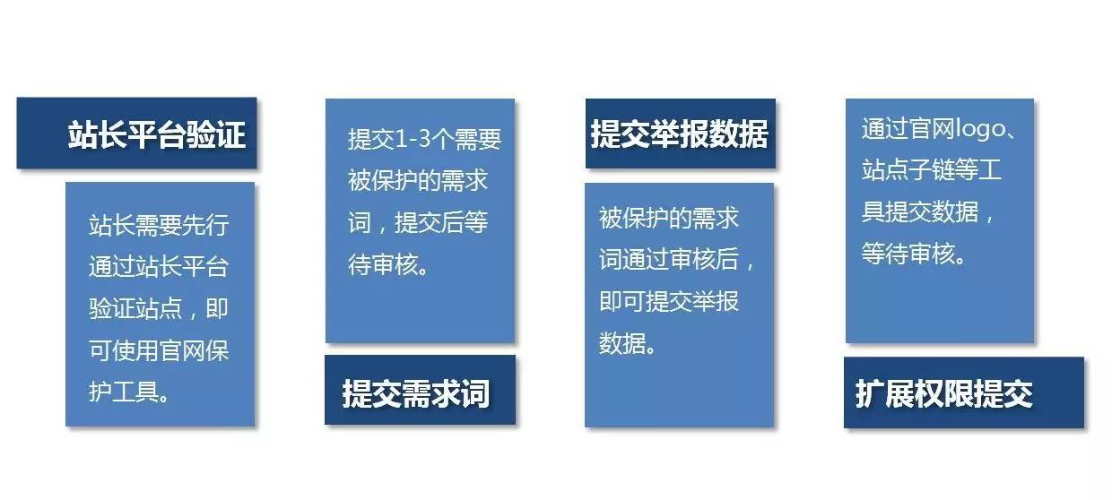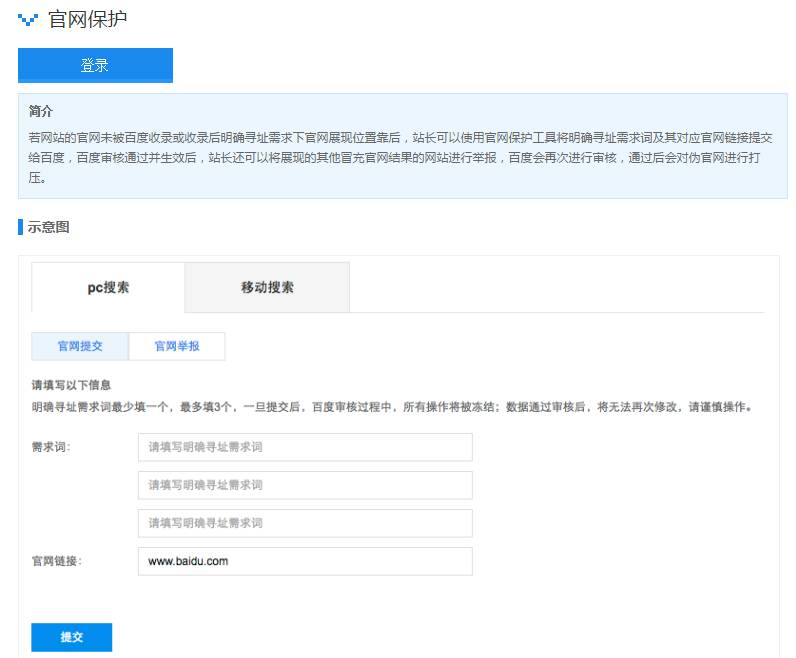 用戶登錄百度賬戶,然后進(jìn)入官網(wǎng)保護(hù)功能頁面,按要求填寫三個(gè)要保護(hù)的搜索詞(目前暫時(shí)支持三個(gè)詞),最后提交,待百度核實(shí)網(wǎng)站真實(shí)信息后就會(huì)生效。保護(hù)生效后,可以使用舉報(bào)功能對(duì)防冒站進(jìn)行處理。